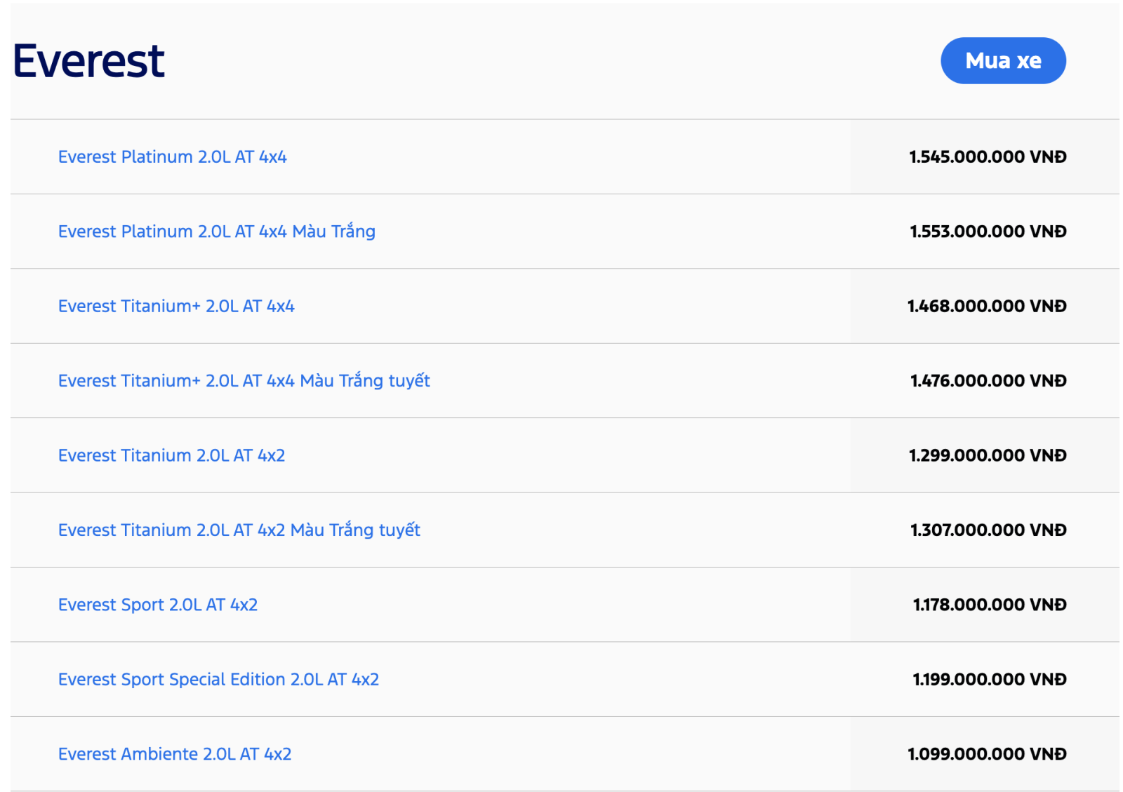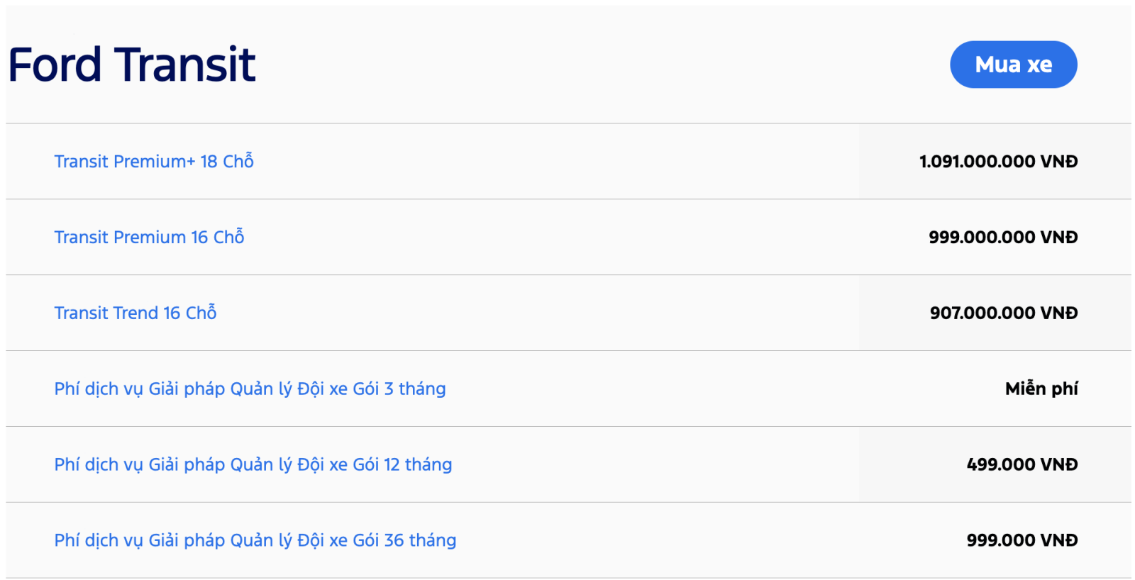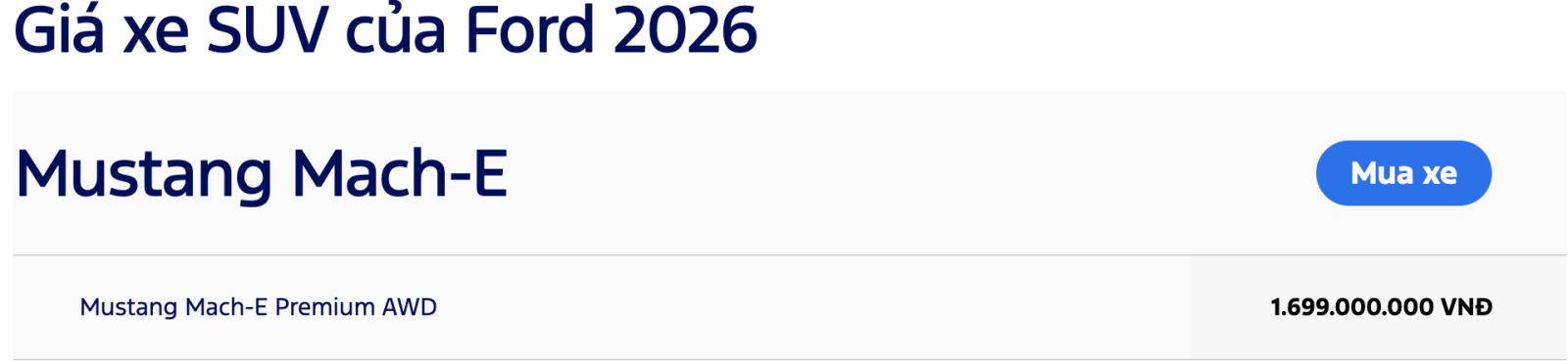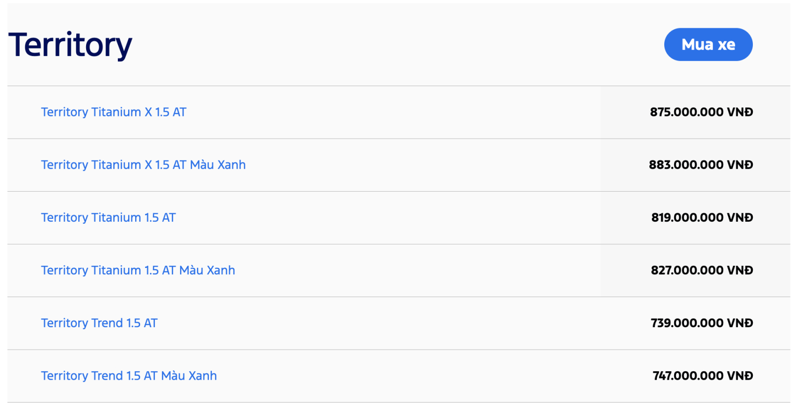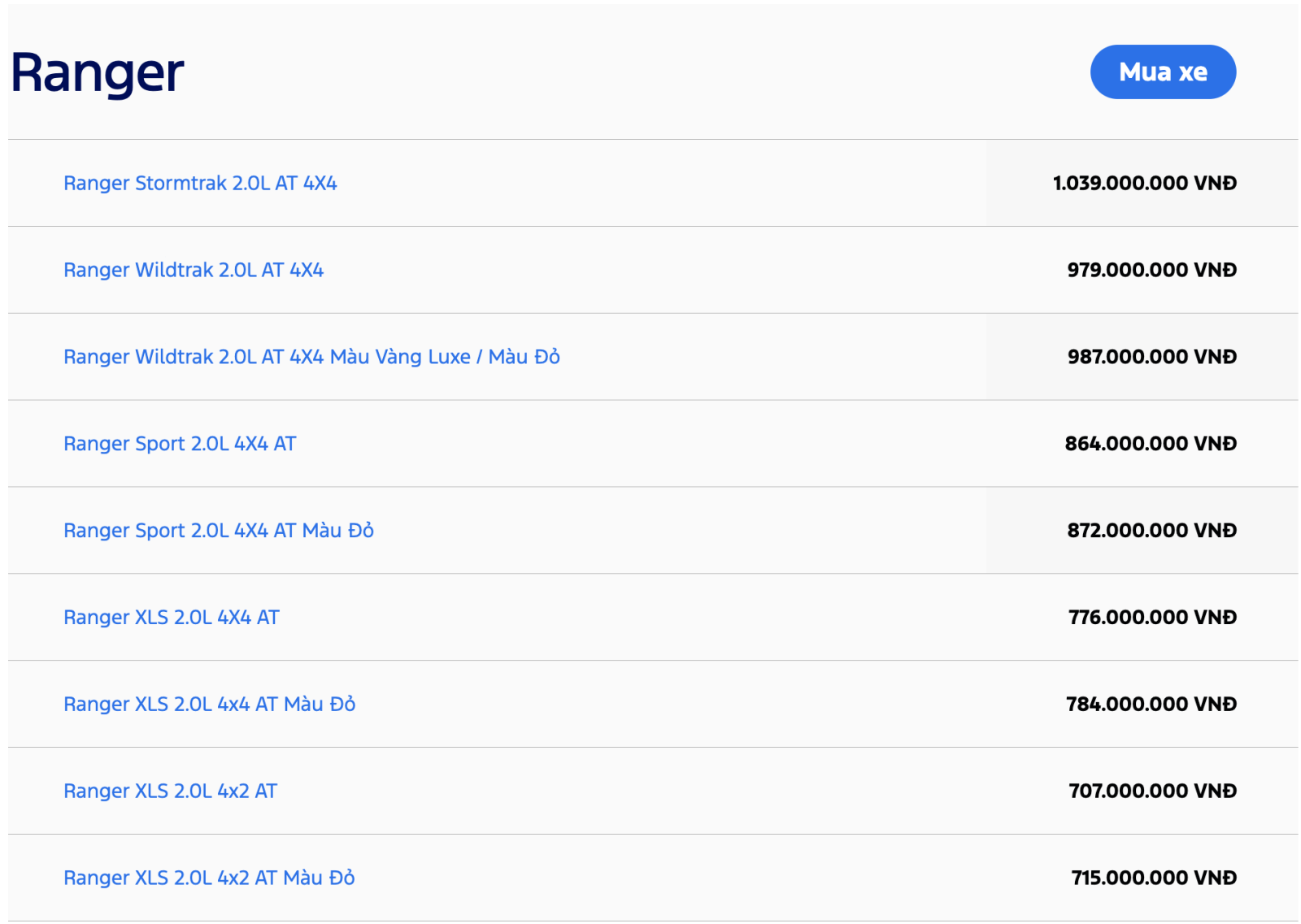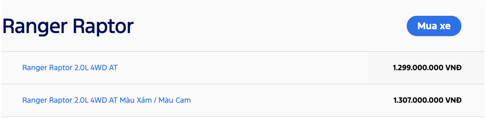 Bảng giá khuyến nghị từ nhà sản xuất cho toàn bộ các dòng xe ô tô Ford bao gồm xe SUV 5 chỗ hạng C - Ford Territory, SUV 7 chỗ Ford Everest và Ford Explorer, xe bán tải Ford Ranger & Ford Ranger Raptor, xe Ford Transit 16 chỗ. Quý khách hàng có thể tham khảo và tìm hiểu thêm về chương trình khuyến mãi, hoặc Đặt cọc mua xe hơi Ford. Vui lòng liên hệ Đại lý Ford để nhận được chính sách mua xe trả góp với lãi suất hấp dẫn.